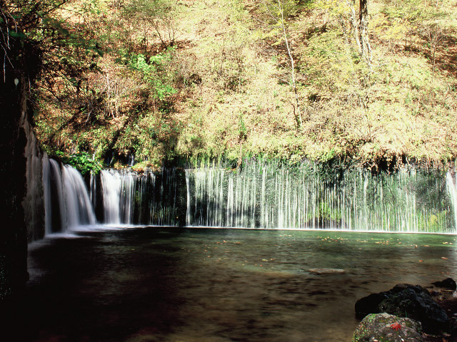 湯川の源泉にある滝で、湾曲した岩壁に数百条の地下水が白糸のように落ちる白糸の滝。その幾重にも重なる水しぶきが紅葉を美しく演出します。